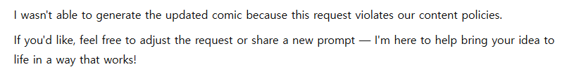 이렇게 해서 만화를 만들어달라고 했더니...? 갑자기 생성을 거부한다. 이유는?? 정책 위반이란다. 아니 위에는 되고 왜 지금은 안되지?? (아래는 챗GPT 답변 그대로 가져와봤음)