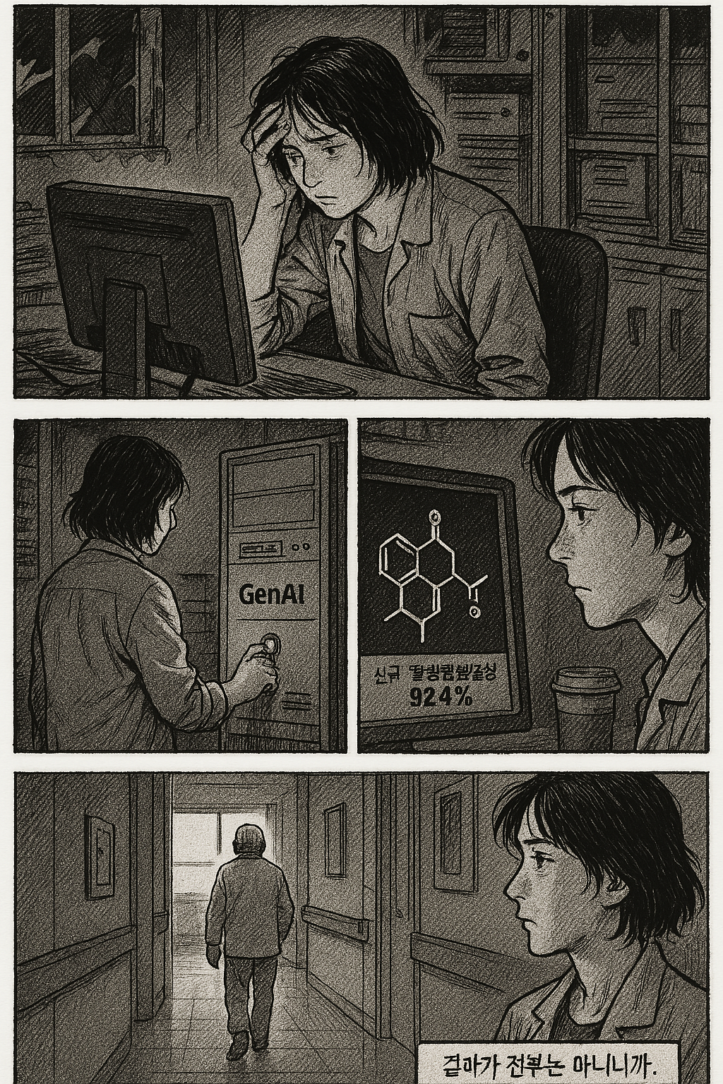 프롬프트: [생성형 AI와 신약개발]을 주제로 4컷 만화를 만들고 싶은데, 이미지를 절대 바로 생성하지 말고 각 장면당 어떤 컷이 나올지 대사와 인물(등장시) 혹은 장면에 대한 설명을 한줄로 작성해줘. 또, 4컷 만화 그림체 스타일은 OOO 만화 같은 스타일로 해줘