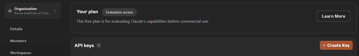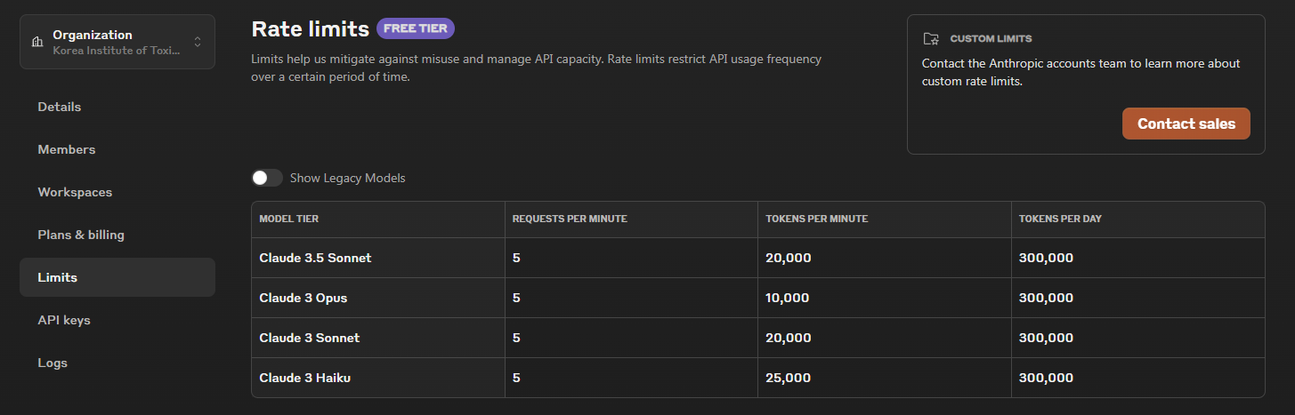 Limits 탭에 들어가면 무료로 얼마나 사용가능한지 보여준다. Limit을 초과하지 않는 한도 내에서 시험해볼 수 있다. 클로드는 다 좋은데, 현 시점에서 임베딩 모델을 제공하지 않는 것이 아쉽다. 임베딩 모델은 RAG를 구현할 때도 필수적으로 사용하게 되는데, 임베딩 모델도 같이 있다면 유료 사용을 고민해볼만 하다고 생각한다.