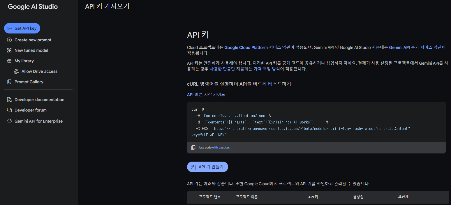 위 화면에서 조금만 내리면, '지금 사용해보기' 버튼이 있다. 그걸 누르면 바로 Google AI Studio로 이동하게 되고, 여기서API 키를 생성할 수 있다. 아직 사용은 안 해봤지만 벌써 가슴이 두근두근..