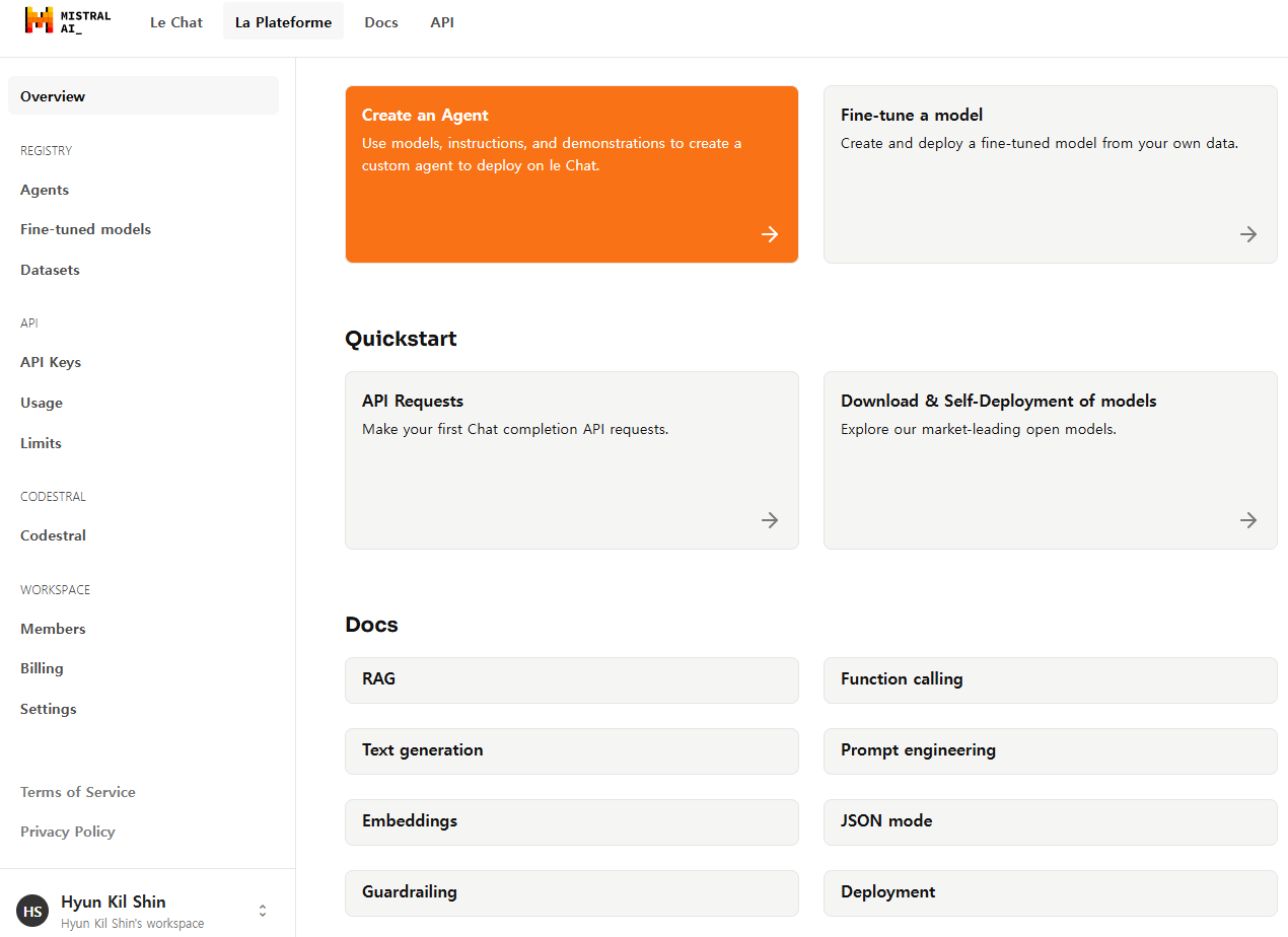 미스트랄AI가 프랑스에 본사를 두고 있어서 프랑스 단어가 곳곳에 쓰여 있다. Le chat에서도 그렇고 Le Plateforme 도 앞에 Le가 프랑스어 관사다. Le Plateforme탭을 클릭해서 들어오면 다양한 옵션이 제공되고 있는 것을 볼 수 있다. 아래 스크린샷에서 API keys에 들어가면 키를 생성할 수 있고, limits에 들어가면 사용 한도가 적혀 있다. 꽤 많은 양의 토큰을 쓸 수 있는 것으로 보이는데, 무료로 쓰는 대신 내가 사용한 데이터는 모두 mistral AI에서 데이터로 활용하겠다고 한다. (처음에 사용할 때 어딘가 언급이 있었는데, 지금은 못 찾겠다) 나도 LLM으로 이것저것 실험을 하고 있는 중이다보니, 무료로 다양한 API 기능을 적용하면서 시연을 할 수 있으니 윈윈할 수 있는 좋은 모델이라는 생각이 든다.