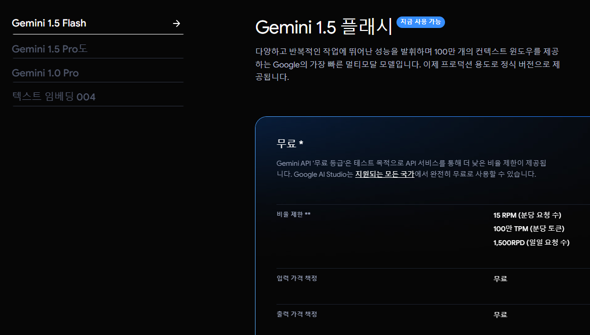 일일 요청 수 제한만 있으면 상당량을 써볼 수 있을 것 같다. 그래서 조만간 꼭 써봐야겠다는 생각이 들었다. 멀티모델 모델도 있고, 텍스트 임베딩 모델도 제공해주고 있으니 여러가지 애플리케이션을 만들어 볼 수 있을 것 같다.