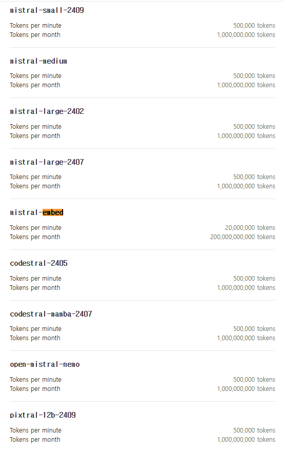 Limits에서 한달에 얼마나 사용 가능한지 모델별로 정리가 되어 있다. 다양한 모델이 있다보니 일부 모델만 스크린 샷으로 찍을 수 있었다. embed가 임베딩 모델이다. 상당히 많은 양을 쓸 수 있어서 미스트랄로 RAG를 만들어서 테스트해봐도 좋을 것 같다.