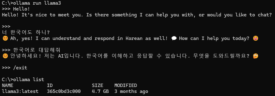 노트북 사양은 CPU Intel i7 1.8GHz, Memory 16GB 인데, 약간 답변이 느리긴 하다. GPU에서 사용하고 싶은데 세팅에 실패해서 일단 CPU에서 사용하고 있다. 윈도우에서 써봤고, 커맨드 창에서 모델을 불러와서 사용한다. 영어로 대답할 때는 이모티콘을 안 썼는데, 한국어로 대답을 요구하니 갑자기 이모티콘을 남발하기 시작했다. 우리가 이모티콘을 많이 쓰기는 하나보다...