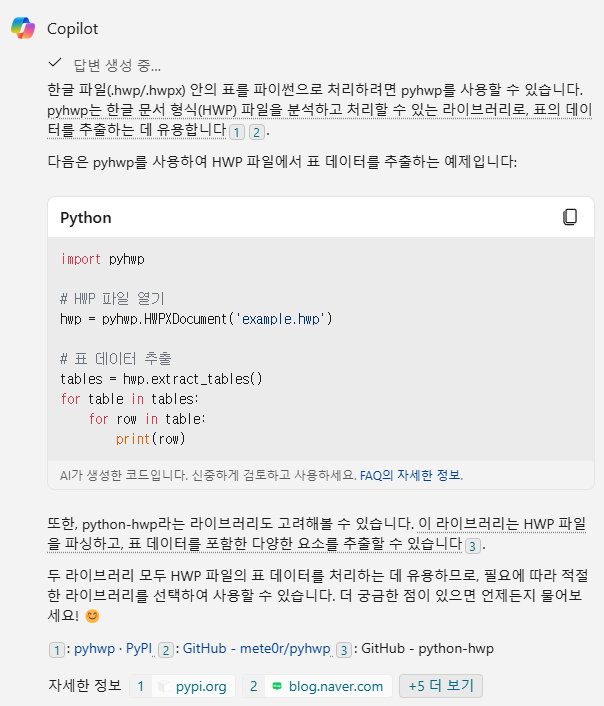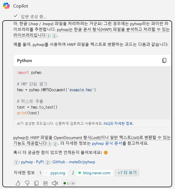코파일럿에 한번 물어봤는데, 한국어를 처리하는데 필요한 라이브러리를 알려줬다. 그래서 내가 원하는 것은 그냥 한글이 아니라 한글 (.hwp)파일 이라고 다시 물어봤고, 라이브러리를 하나 추천해줬다.