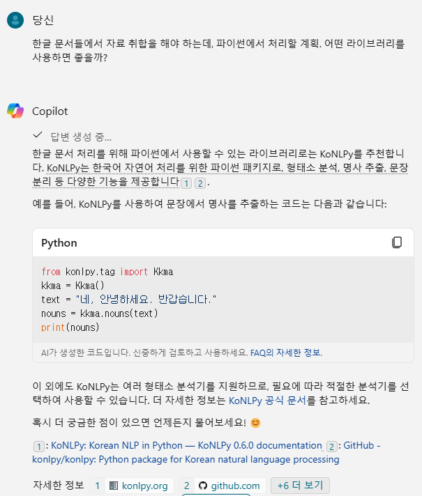 다만 라이브러리도계속 업데이트가 되기 때문에 요즘엔 코파일럿으로 코딩 작업을 많이 하는 편이다. 최근에 나온 라이브러리도 잘 찾아준다. 예를 들어서 한글 문서에서 자료 취합할 때 파이썬으로 작업을 하겠다고 하면, 이러한 내용을 코파일럿에 물어보면서 사용할만한 라이브러리를 찾아보고, 어떤 방식으로 접근할 수 있는지 물어보면서 코딩을 시작할 수 있다.