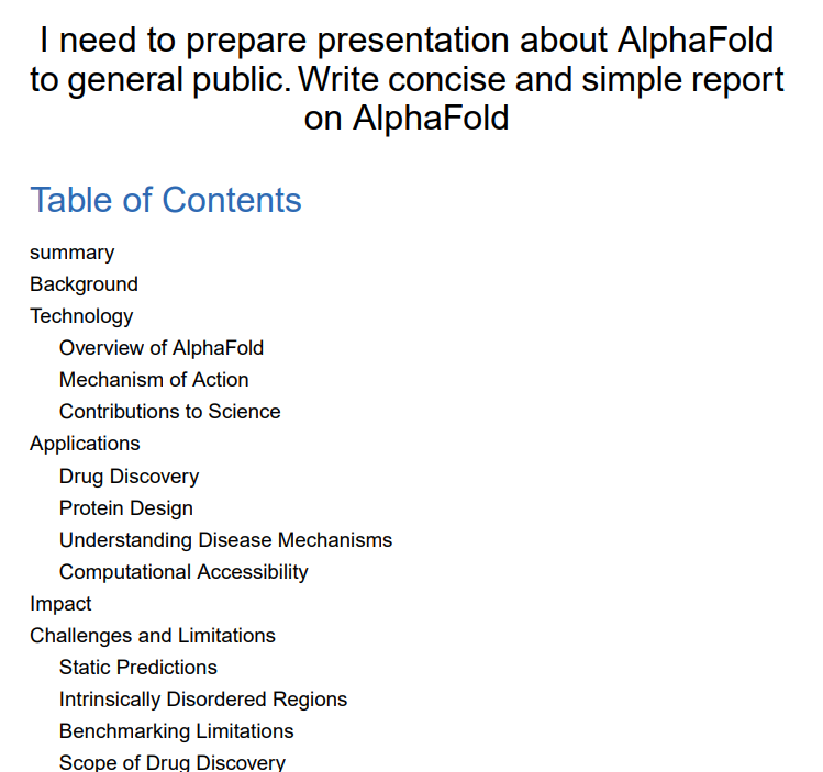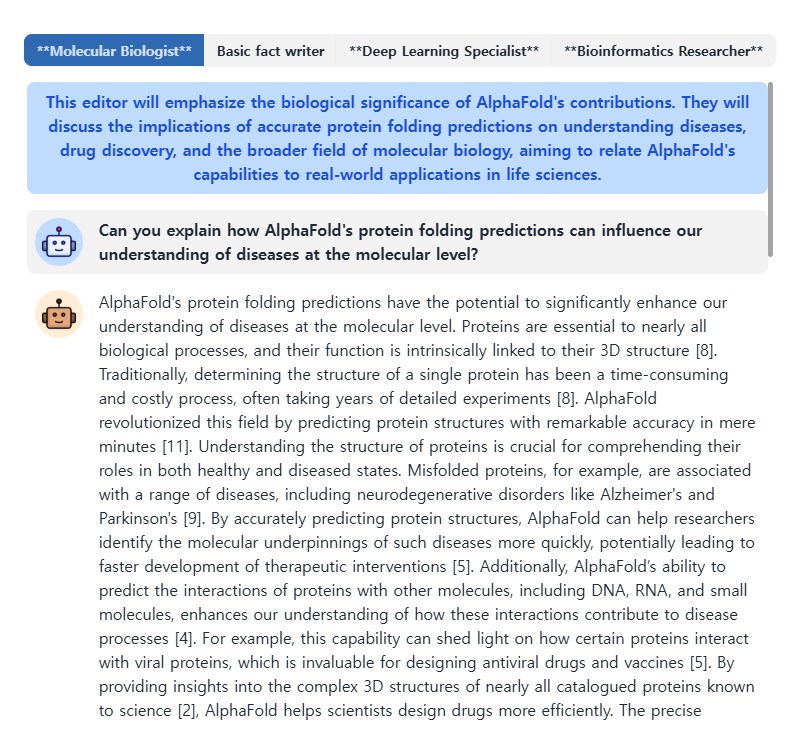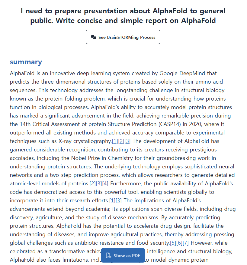 에이전트 기반으로 자료를 정리해서 보고서를 작성해준다. STORM에서는 AI끼리 서로 브레인스토밍을 진행한 후에 글을 작성한다. 브레인스토밍한 내용을 확인해볼 수도 있다. AlphaFold에 대해서 정리를 요청했는데, AI끼리 열심히 아이디어 회의를 한 후에 자료를 조사해서 보고서를 정리해줬다.