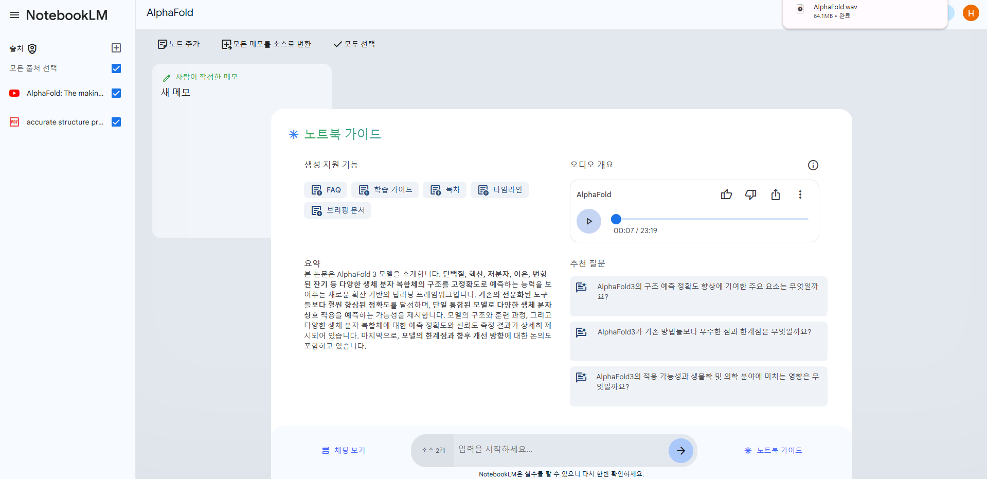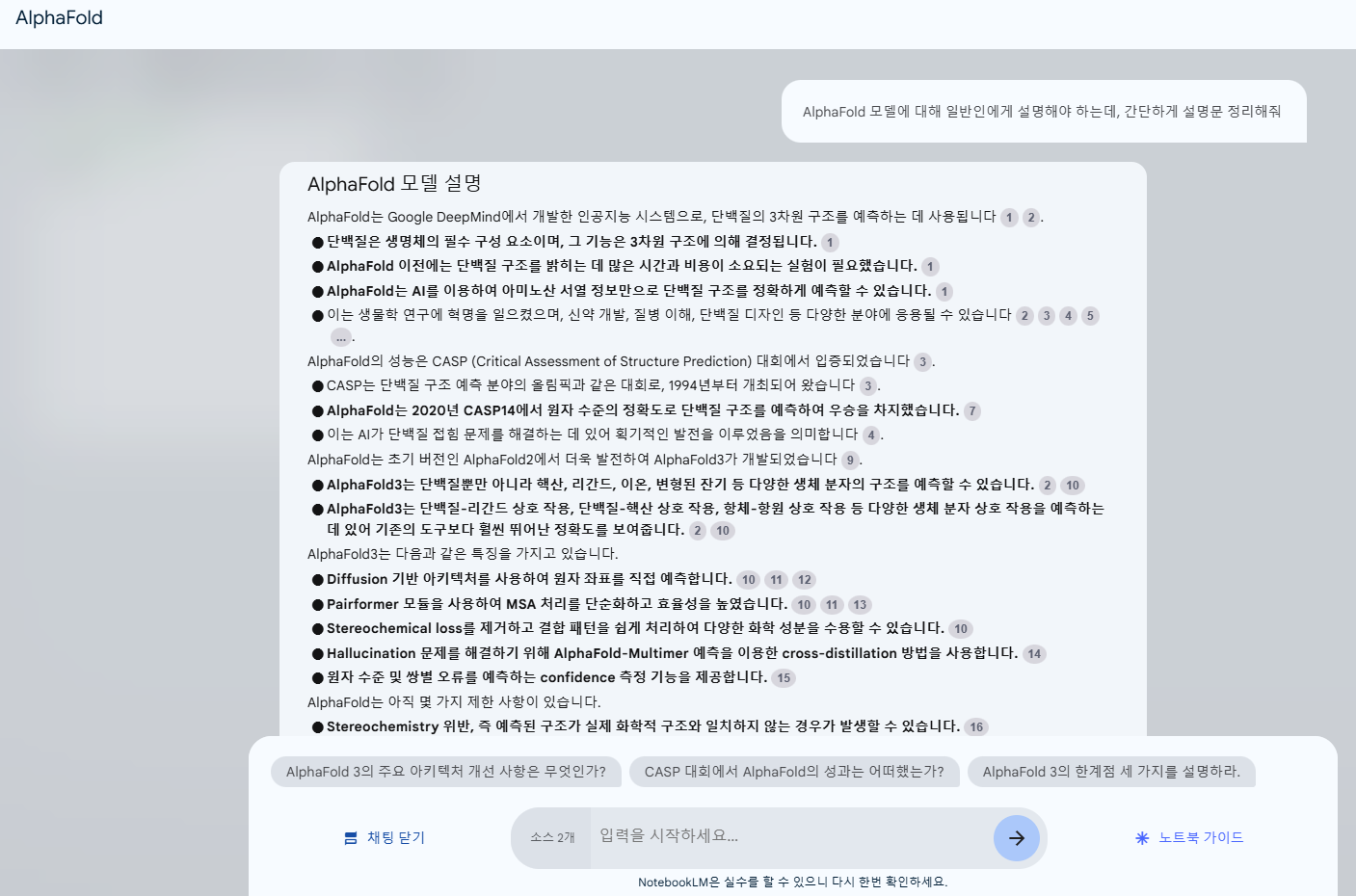 이번에 알파폴드에 대해서 발표할 기회가 있어서 아래와 같이 사용해봤다. 딥마인드에서 올려놓은 유튜브영상과 알파폴드 논문 파일을 함께 올린 후 알파폴드에 대해서 이것저것 질문을 해봤다. 아래와 같이 관련 내용에 대해서 질문을 해볼 수도 있다.